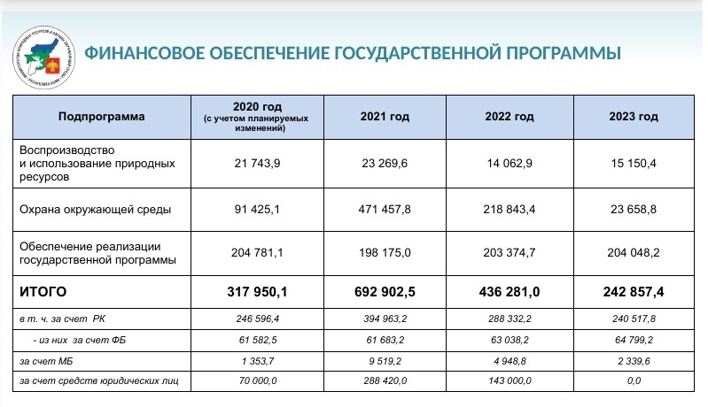 Объем финансового обеспечения госпрограммы на 2020, 2021 год и плановый период 2022 и 2023 годов и составляет 1 миллиард 689 миллионов рублей, в том числе средства республиканского бюджета – 1 170 409,6 тысяч рублей, федерального бюджета – 251 103,1 тысяч рублей, бюджетов муниципальных районов - 18 161,4 тысяч рублей, юридических лиц - 501 420 тысяч рублей.