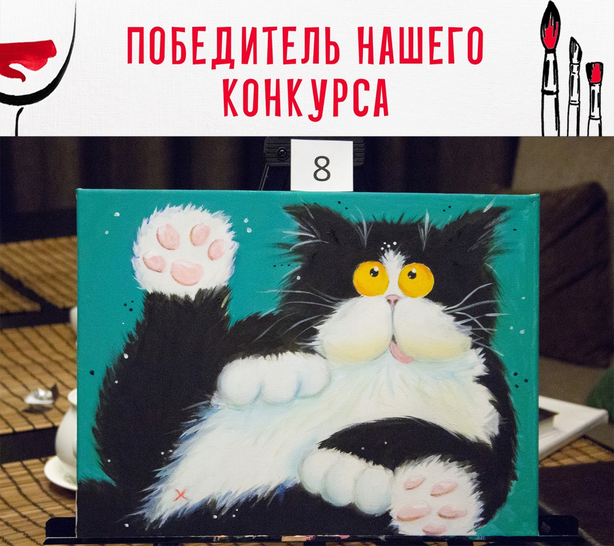Нам выдали фартуки, холсты, натянутые на рамы, кисти и краски. Также в стоимость были включены и напитки на выбор: вино, чай или кофе. В тот вечер мы рисовали картину "Безумный кот". Ведущая была вежлива и внимательна, художник помогала, когда возникали трудности. Мы писали картину шаг за шагом, нам показывали, какую краску надо взять, как и с чем ее смешать, и как и где нанести. Хочется сказать ведущей и художнику отдельное спасибо — таких милых и доброжелательных людей еще нужно найти! Они на самом деле помогали каждому человеку, независимо от его навыков, нарисовать свой маленький шедевр!