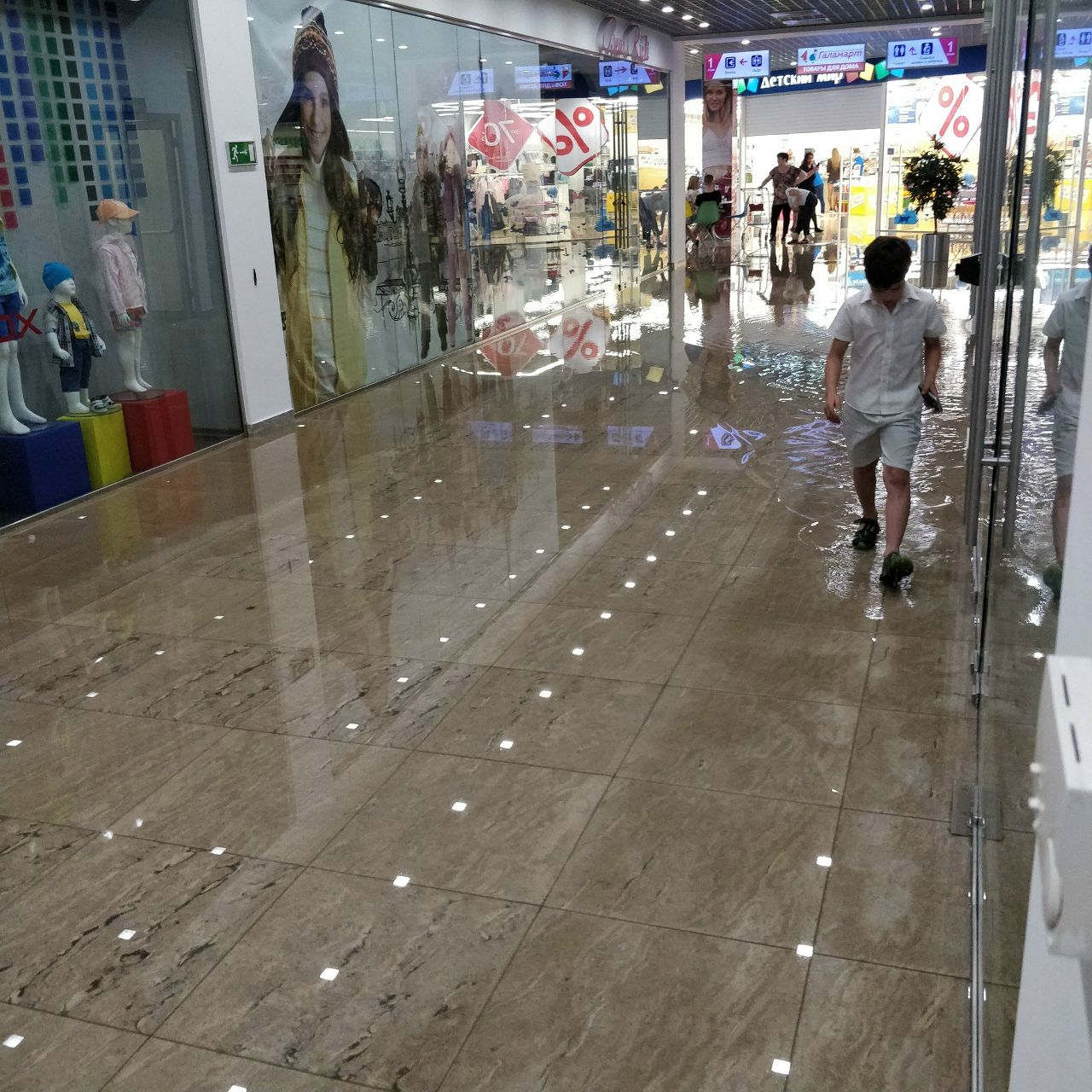 Гроза и ливень не пощадили не только улицы, но и торговый центр "Ярмарка". Ухтинцы, которые решили скрыться от непогоды под крышей комплекса, попали в неприятную ситуацию. В помещениях затопило пол. Однако непонятно, откуда прибывает вода: стекает ли она с потолка по стенам или прибывает снизу. Тем не менее, посетители "Ярмарки" ходят по воде, уровень которой пока достигает лишь подошвы. Но кто знает, сколько еще продлится гроза, и насколько сильно затопит Ухту.