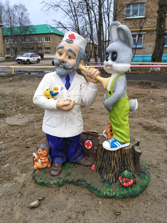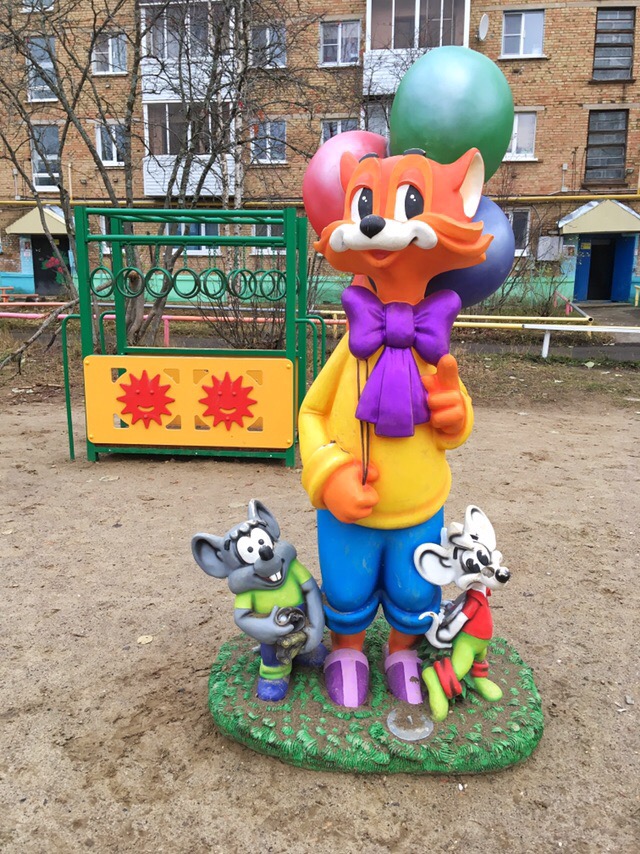 Самой интересной частью двора стали бетонные с добавлением полимеров фигурки. Их доставили прямиком из Екатеринбурга. Теперь маленьких жителей поселка будут радовать кот Леопольд с мышками, Тортилла и Буратино, Айболит и зайчик. Самой дорогой стала скульптура кота Леопольда. Его цена около 60 тысяч рублей.