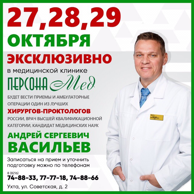 27, 28, 29 октября. Персона Мед. Андрей Сергеевич Васильев, хирург-проктолог, врач высшей квалификационной категории, кандидат медицинских наук. Прием и амбулаторные операции.(Советская, 2. Запись 74-88-33, 77-77-18, 74-88-66)