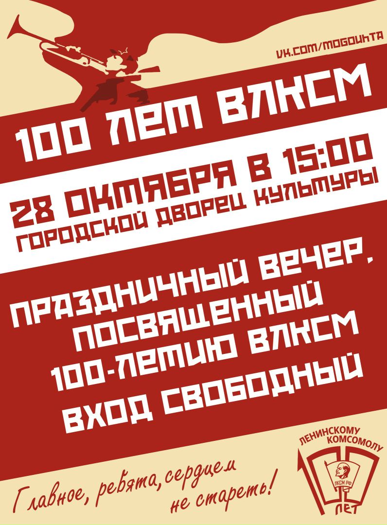 28 октября, 15 часов. ГДК. Торжественный вечер, посвященный 100-летию ВЛКСМ.