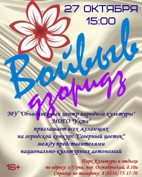 27 октября, 15 часов. Парк КиО. Конкурс между представителями НКА МУ «Объединенный центр нродной культуры» МОГО «Ухта» «Северный цветок».