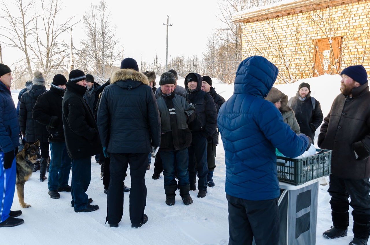 Итак, собрав всё необходимое, мы прибыли на место - площадку за оптовыми базами в Рабочем поселке. Нас уже ждали. Признаюсь честно, я ожидала увидеть группу маргиналов в лохмотьях, благоухающих соответствующими ароматами и изъясняющимися отнюдь не цензурной бранью. Однако, всё оказалось совсем не так! Вполне прилично одетые (обзавестись предметами гардероба им также помогает "Милосердие") граждане деловито выстроились в линию и, тихо переговариваясь, терпеливо ждали своей очереди. Получив порцию, так же спокойно отходили, благодарили и принимались за трапезу. Постепенно подтягивались "опаздывающие", в итоге собралось 16 человек. Как сообщил Александр, всему виной 25-градусный мороз, обычно на кормление приходит около 30 человек.