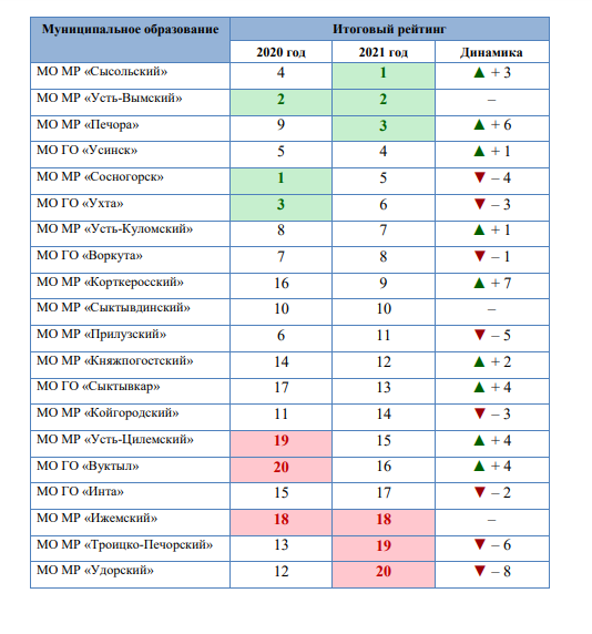 Глава Ухты занял в рейтинге по итогам 2021 года 6-е место (занимал 3-е в 2020 году), глава Сосногорска — 5-е (занимал 1-е в 2020 году). Также из доклада следует, что жители Ухты “высоко оценивают” качество дошкольного образования и жилищно-коммунальных услуг, но при этом в городе “низкий уровень” удовлетворенности качеством общего образования и обеспеченности спортивными сооружениями. Сосногорцы же “высоко оценивают” качество дошкольного образования и организацию водо- и газоснабжения. При этом в Сосногорске “низкий уровень удовлетворения” транспортным обслуживанием, качеством общего образования, работой органов местного самоуправления и качеством услуг в сфере культуры.