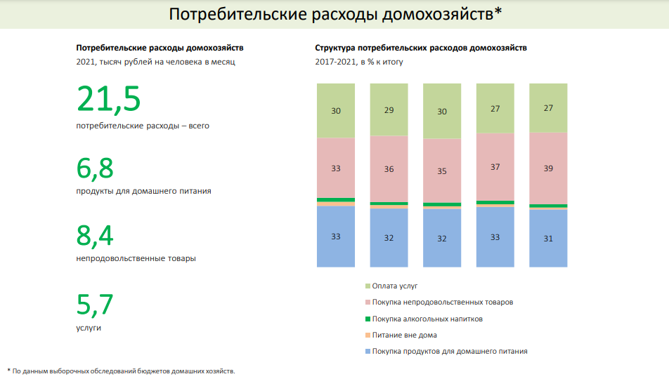 Если обратиться к данным о структуре потребления в Республике Коми, то по информации, что представлена в исследовании Комистата, в 2021 году в среднем житель региона тратил порядка трети (31%) от своих доходов на покупку продуктов питания, более трети уходило на непродовольственные товары (39%), 27% от дохода тратит на оплату услуг. Оставшиеся 3% трат приходятся на покупку алкогольных напитков и питание вне дома. Статистику за 2022-й можно будет подвести в следующем году. В нынешних экономических и геополитических условий она, вероятно, может значительно отличаться от данных за минувший год.