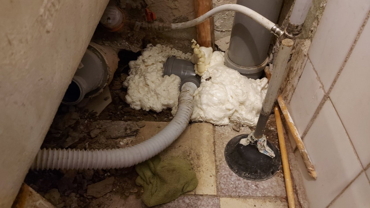 “Мастера” раздолбили пол, добрались до труб и запенили их монтажной пеной. Готово. И ходи, Алевтина Сергеевна, пожалуйста, справлять нужду в ванную.