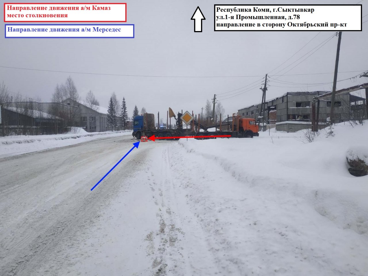 В столице Республики Коми в минувший понедельник — 27 февраля в 10:10 — случилось дорожно-транспортное происшествие. Грузовик КамАЗ врезался в большегруз Mercedes-Benz. 47-летний водитель отечественного грузовика, выезжая со двора жилого дома на улице 1-я Промышленная, не уступил водителю Mercedes, который двигался по главной дороге.