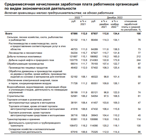 Согласно представленным статистическим данным — за декабрь 2022-го — средняя номинальная начисленная заработная плата в Коми составляет 87 937 рублей. Если сравнивать с данными за декабрь 2021 года, то номинальная начисленная зарплата выросла на 12,6%. Выплаты для работников в декабре традиционно выше за счет премий, что выплачивают работодатели по итогам работы за минувший год. Среднее годовое значение начисленной заработной платы в целом за 2022 год в республике составило 67 895 рублей, что также на 12% выше в сравнении с показателями 2021 года.