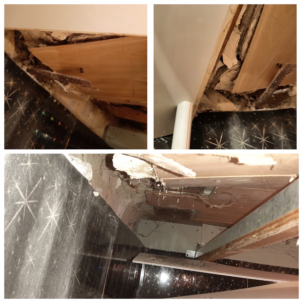 Пока что ущерб не такой серьезный, подручными средствами удается сдерживать полное обрушение — пластиковые панели потолка приходится поддерживать палками и кастрюлей. Сразу, как произошло обрушение, Наталья Алексеевна стала звонить везде, куда могла, обзвонила около восьми номеров. Ни в одном из мест ей помочь не смогли: