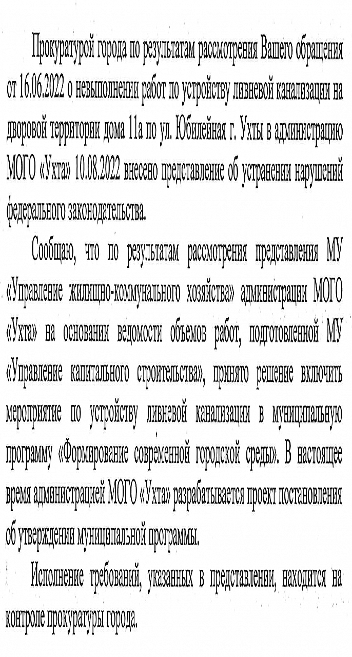 Более того, глава МОГО "Ухта" М.Н. Османов в личном письме на обращение жителей сообщил, что проблема взята на контроль и мероприятия по устройству ливнёвой канализации включены в проект бюджетной смены.