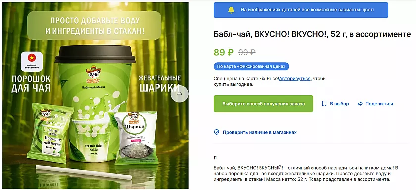 Любители тайваньского чая с шариками поймут. В коробочке — порошок и те самые жевательные шарики тапиоки. Заливаешь водой, размешиваешь, добавляешь лёд — и вот у тебя дома настоящий бабл-чай. Не хуже, чем в кофейне, но дешевле в разы. В ассортименте несколько вкусов, так что можно пробовать и выбирать любимый.