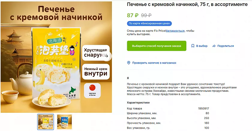 Хрустящее снаружи, с нежной кремовой начинкой — эти штуки явно вдохновлены японским островом, славящимся своими молочными продуктами. В пачке 75 граммов, но съедаются за минуту. Начинка действительно напоминает качественный молочный крем, а само печенье не приторное. Отличный вариант, когда хочется чего-то к кофе, но возиться с десертом лень.