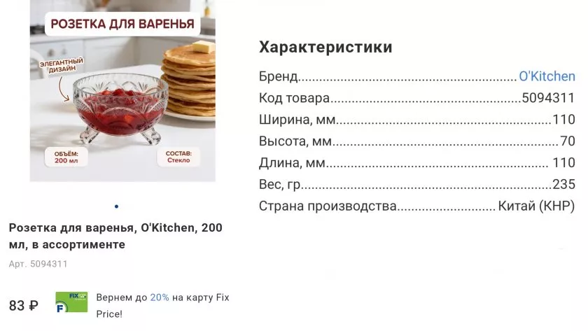 Обожаю, когда всё красиво сервировано. Увидела стеклянную розетку от O'Kitchen и не смогла пройти мимо. 200 миллилитров, аккуратненькая, прозрачная. Можно и варенье положить, и мёд, и сгущёнку. Выдерживает до 80 градусов — я вчера в неё горячий шоколадный соус наливала к блинчикам, всё отлично. На полке рядом целая серия этой марки стояла: и соусники, и ёмкость для мёда, и бутылка для масла с уксусом. Теперь хочу потихоньку собрать весь набор. Свекровь придёт в гости, оценит.