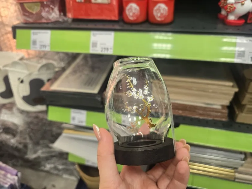 Этот подсвечник я схватила, даже не раздумывая. Прозрачный купол, деревянное основание, изящная форма. Внутри горит свеча, и свет сквозь стекло становится каким-то особенным — мягким, живым, чуть загадочным.