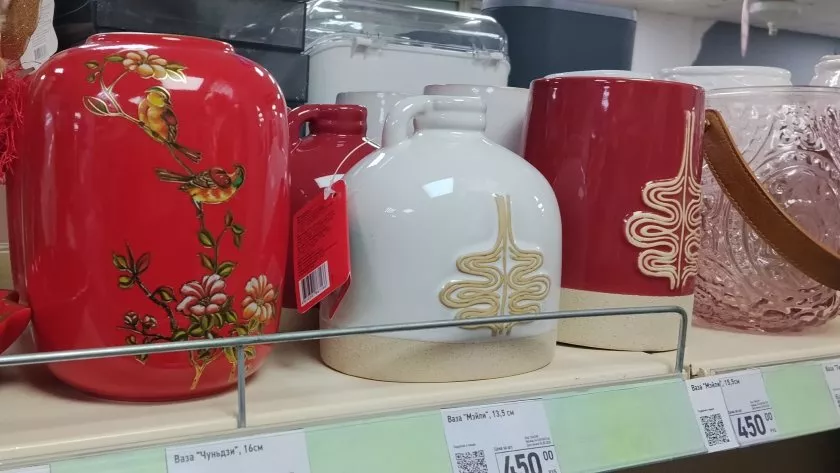 Первое, на что падает взгляд, — эта ваза. Яркий алый фон, тонкие ветви сакуры или цветущих яблонь и крошечные птички. Выглядит солидно и стильно, будто приехала прямиком с восточного базара.