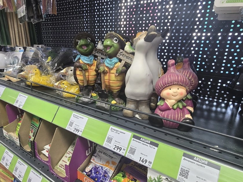 Самое неожиданное и приятное — отдел декора. Не удержалась от полирезиновых фигурок: гномик, панда, птицы — по 99–149 рублей. Ставлю их у клумб, и они действительно преображают участок. Смотрится не по-детски мило и добавляет саду индивидуальности.
