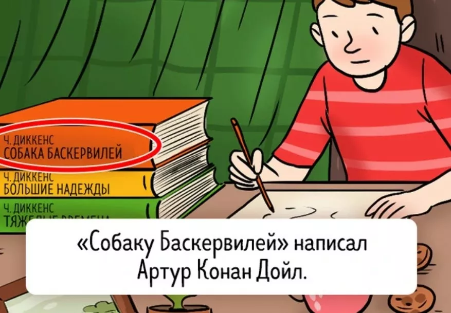 Когда вы изучали изображение, могли заметить нестыковку с именем автора книг. Что именно неправильно? Ведь «Собаку Баскервилей» написал английский автор Артур Конан Дойл. Головоломки на внимательность высоко ценимы, так как они способствуют развитию креативного мышления, воображения и способности к анализу. Таким задачкам стоит уделять внимание.